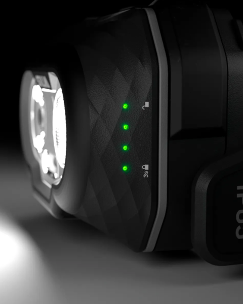 Čtyři boční diody indikují úroveň nabití a stav zamknutí tlačítka proti nechtěnému zapnutí čelovky. v batohu. Plošný COB-LED (Chip On Board) panel pro rovnoměrný rozptyl světla na blízkou vzdálenost. Pro lepší manipulaci a zvýšenou mechanickou odolnost má čelovka hrany potažená pryžovými částmi. Čelovku lze pomocí klipu uchytit na helmu - 38489, lze dokoupit.