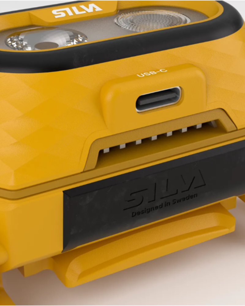 Silva Intelligent Light – rovnoměrný rozptyl světla. Díky napevno integrované dobíjecí Li-Ion baterii 7,5Wh, byla docílena voděodolnosti IP68 – dlouhodobé ponoření do hloubky 1m. Po 500 cyklech nabití/vybití klesne kapacita akumulátoru o cca 30%. Čtyři boční diody indikují úroveň nabití a stav zamknutí tlačítka proti nechtěnému zapnutí čelovky. v batohu. Pro lepší manipulaci a zvýšenou mechanickou odolnost má čelovka hrany potažené pryžovými částmi . Součástí balení je klip na helmu a nabíjecí USB-C kabel.