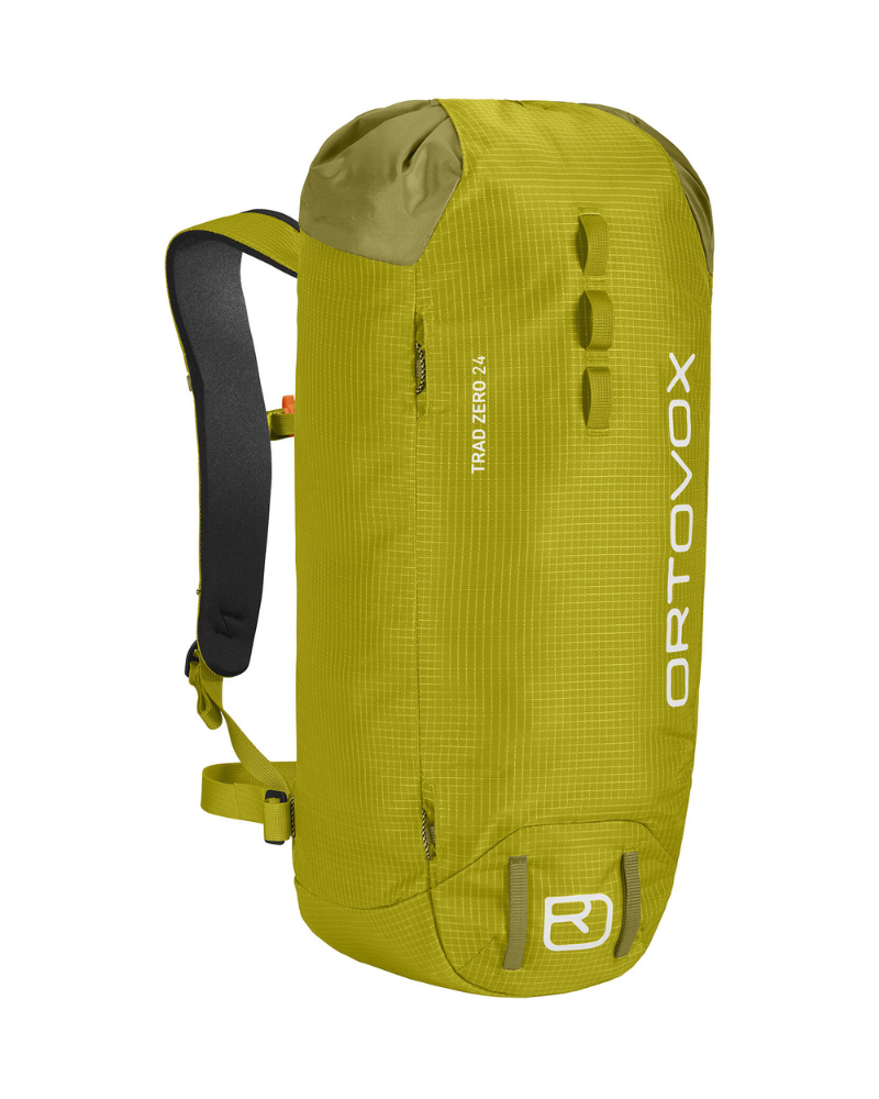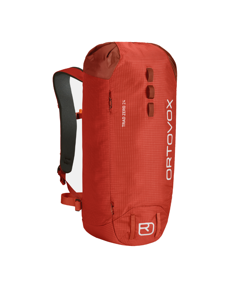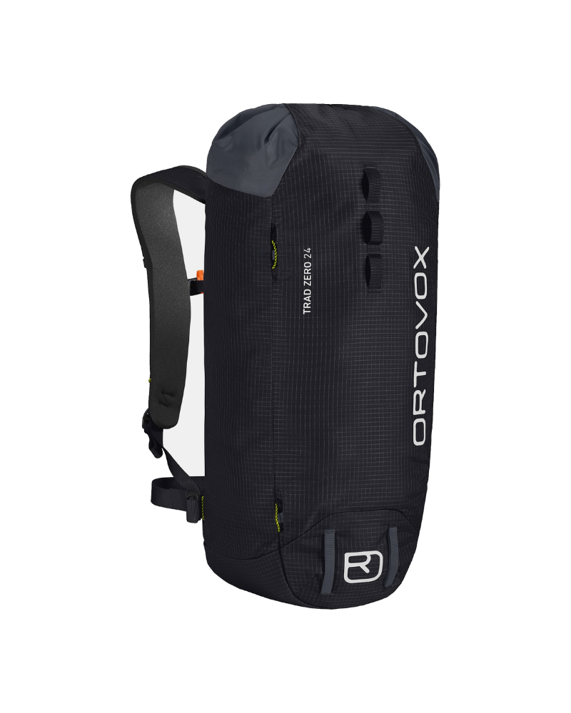 Horský batoh Ortovox Trad Zero 24 má lehkou klopu, která zajišťuje obsah batohu a slouží také k připevnění lana. Nízká hmotnost jde u tohoto modelu ruku v ruce s vysokou odolností, která je při náročném skalním lezení prioritou. Navzdory minimalistickému designu batoh nabízí všechny vymoženosti potřebné k lezení, jako je přihrádka na mapu, úchyt na lano, rukojeti pro přenášení, klip na klíče a SOS pokyny. Na tomto modelu má nastavitelný hrudní popruh bezpečnostní píšťalku.