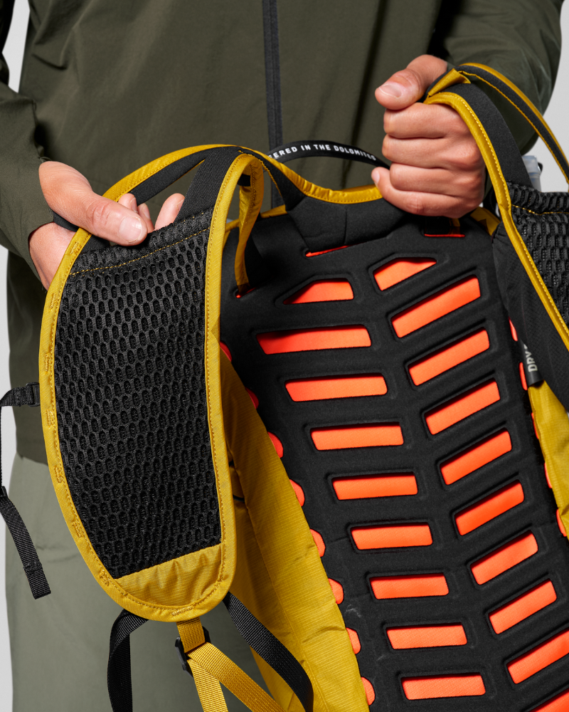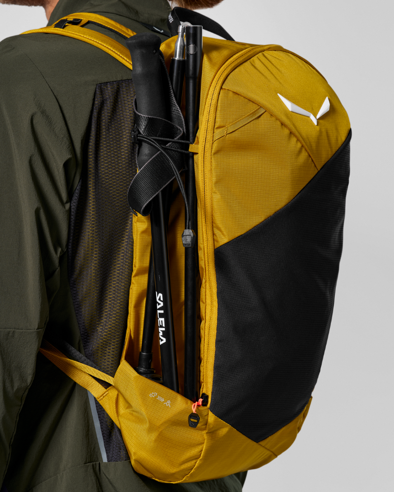 Batoh je vyrobený z recyklovaného ripstopového nylonu, má priedušný nosný systém Dry Back Contact, rozdelené ramenné popruhy, dvojitú kompresiu a bezpečné uchytenie inšpirované vestou.