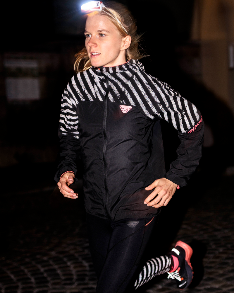 Dámska bunda DYNAFIT TRAIL REFLECTIVE WIND JACKET W - Táto minimalistická bežecká bunda vás chráni pred prechladnutím a vďaka reflexným prvkom zaisťuje lepšiu viditeľnosť v tme.