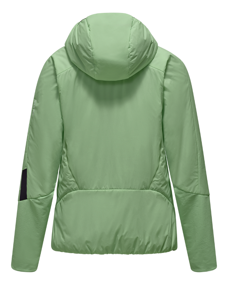 Hybridná izolácia kombinuje tirolskú vlnu s polyesterom (75 % recyklovaného). Duté vlákna zachytávajú vzduch na udržanie telesného tepla. Bunda je vybavená zateplenou kapucňou, sieťovaným predným vreckom a reflexnými prvkami.