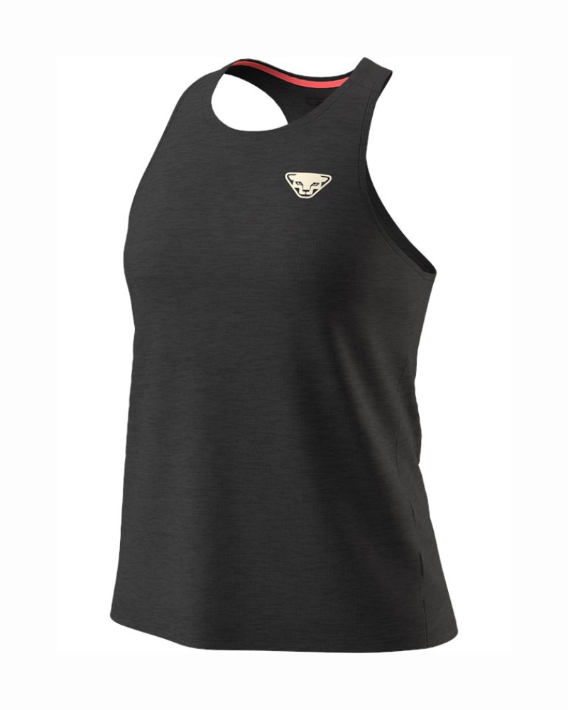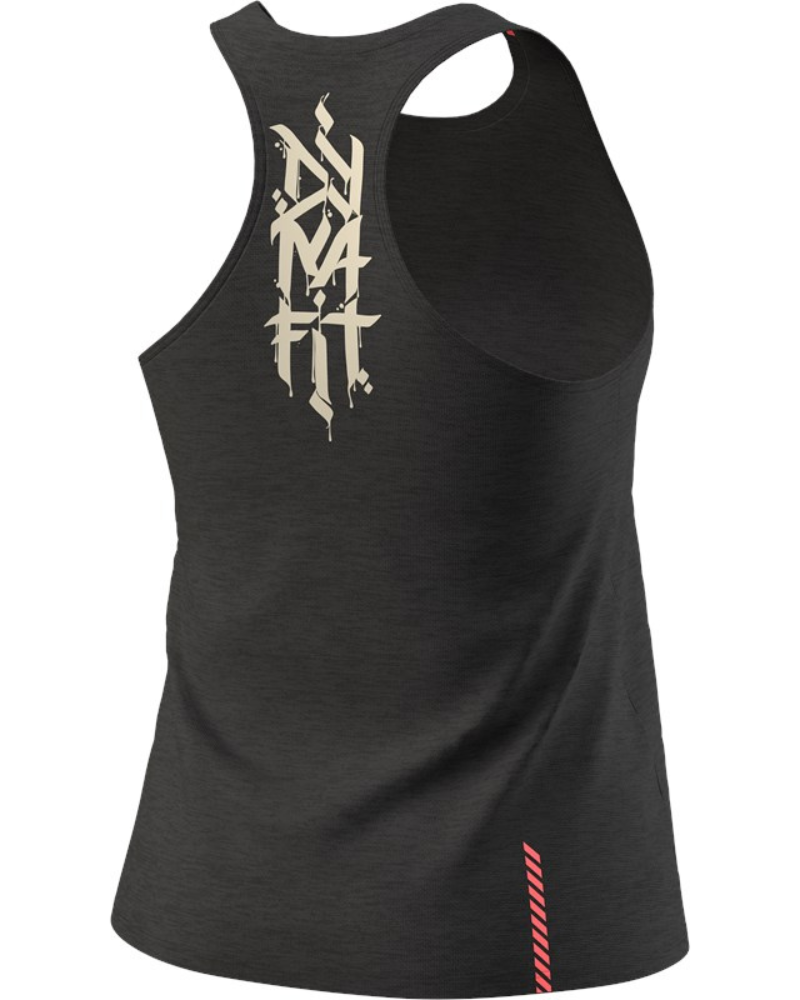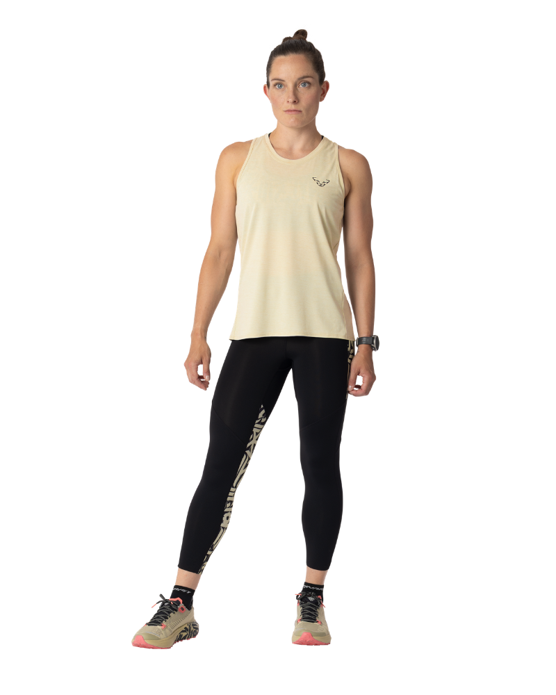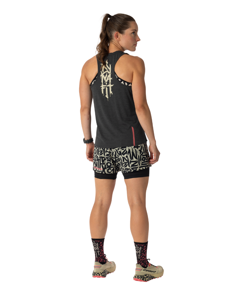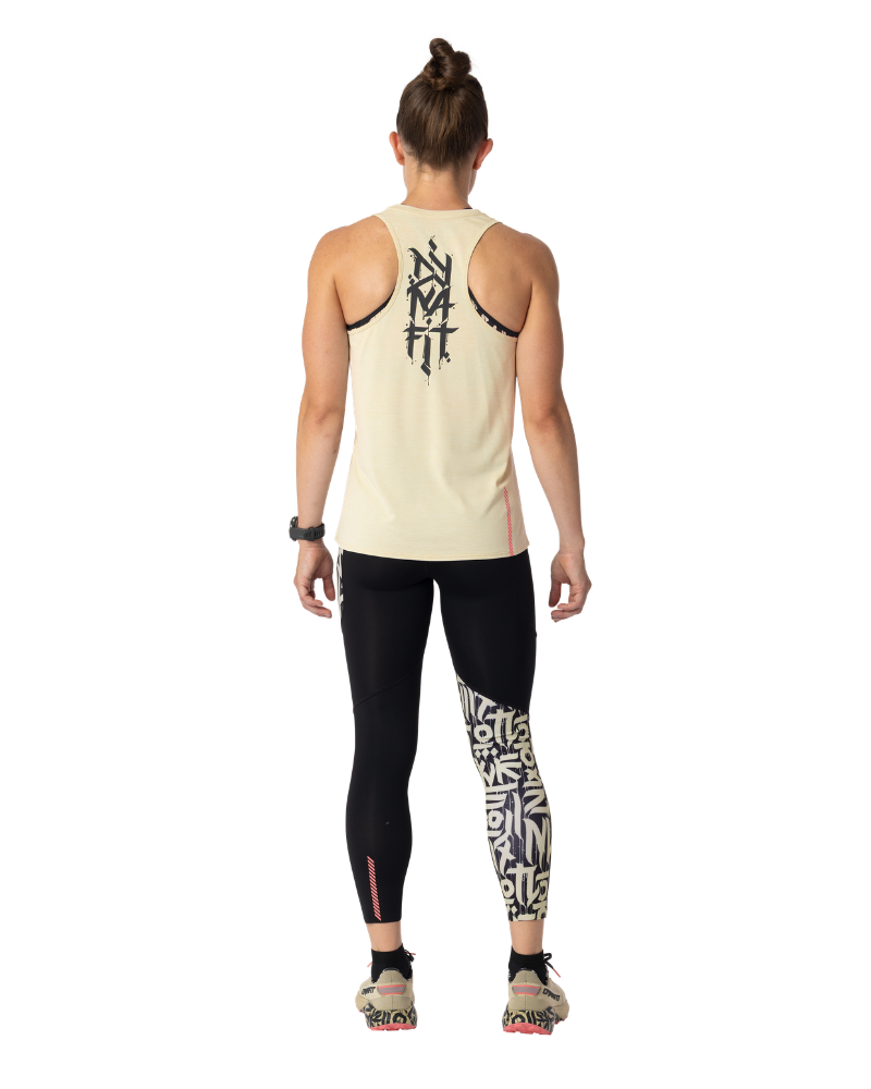 Dámske tielko DYNAFIT TRAIL TANK W kombinuje recyklovaný materiál s pútavým grafickým dizajnom na zadnej strane.