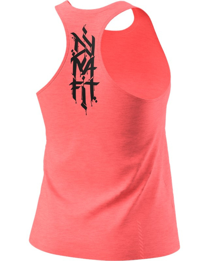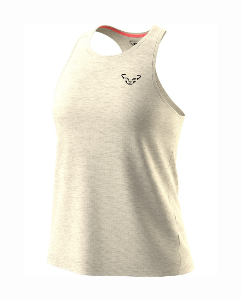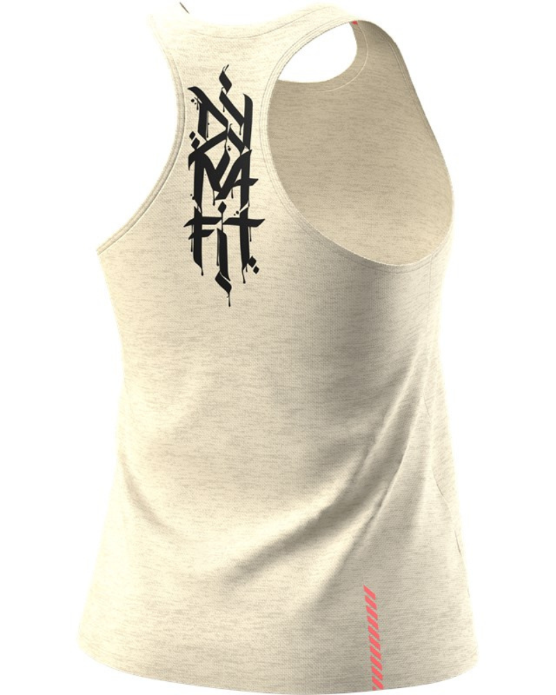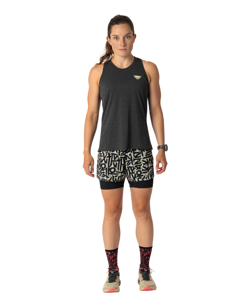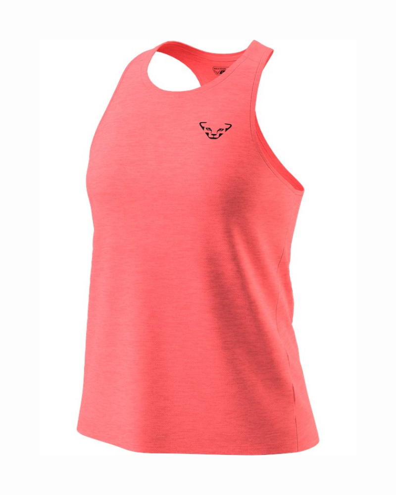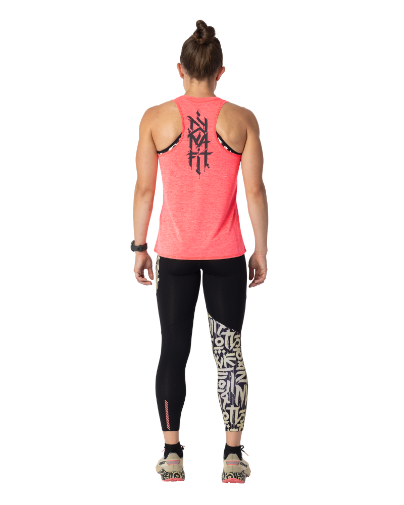 Dámske tielko DYNAFIT TRAIL TANK W kombinuje recyklovaný materiál s pútavým grafickým dizajnom na zadnej strane.