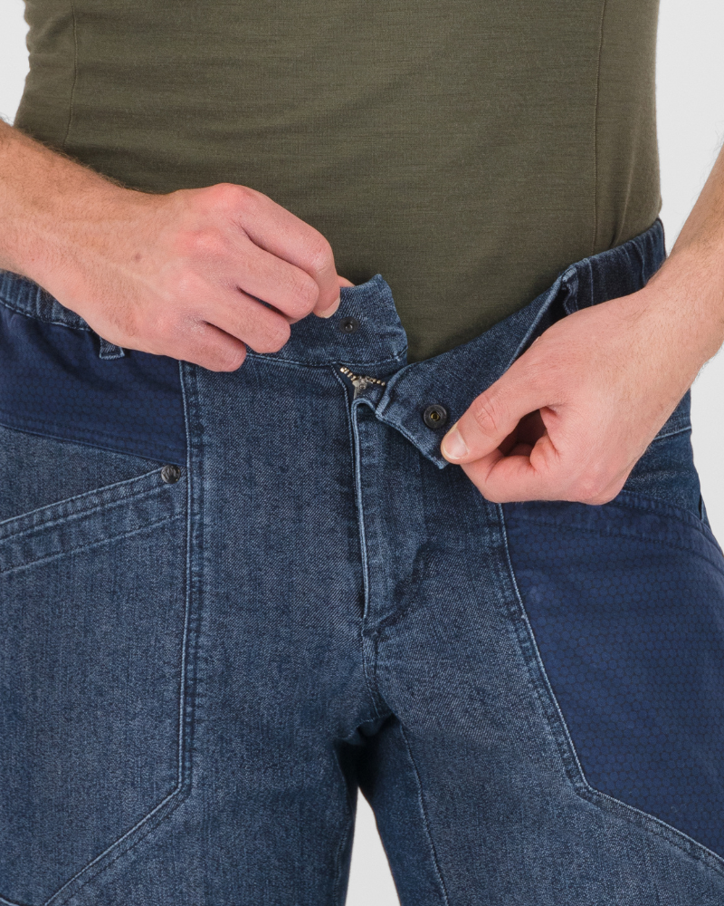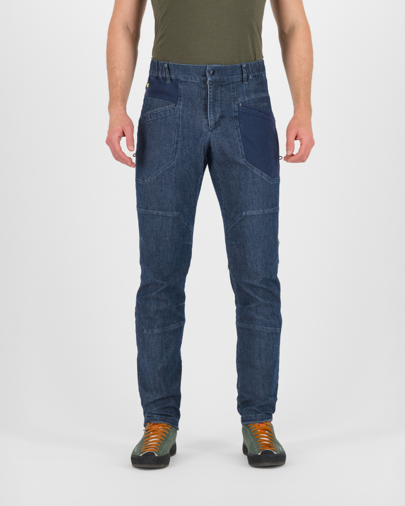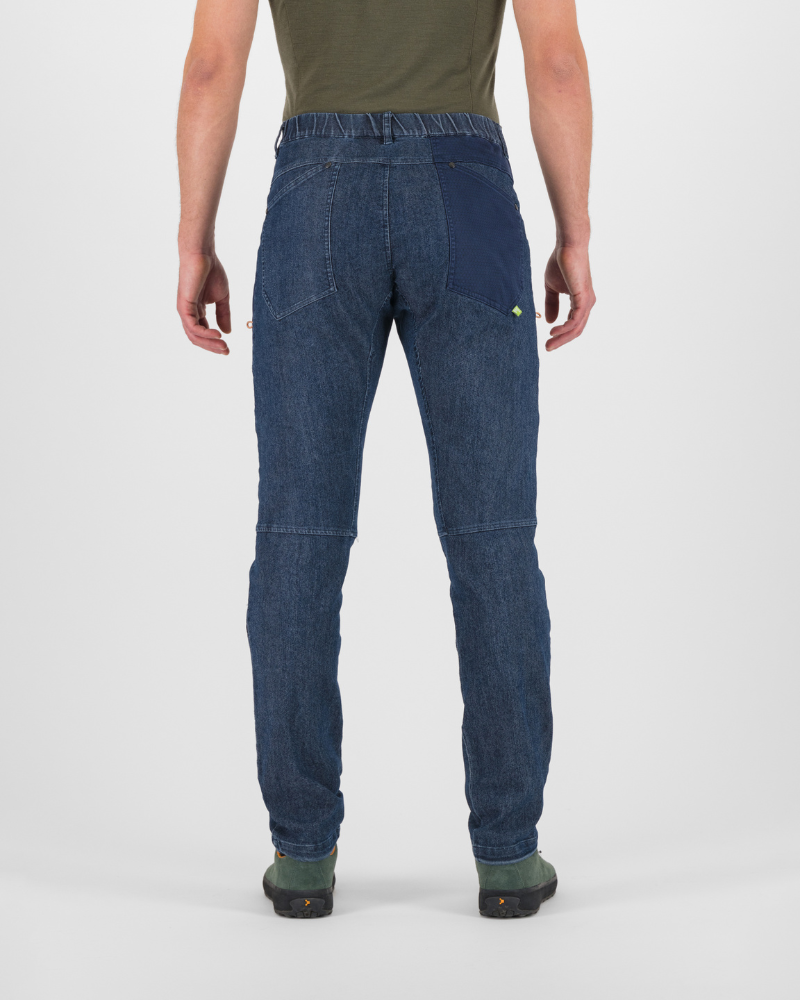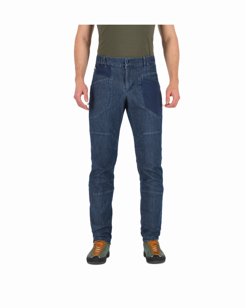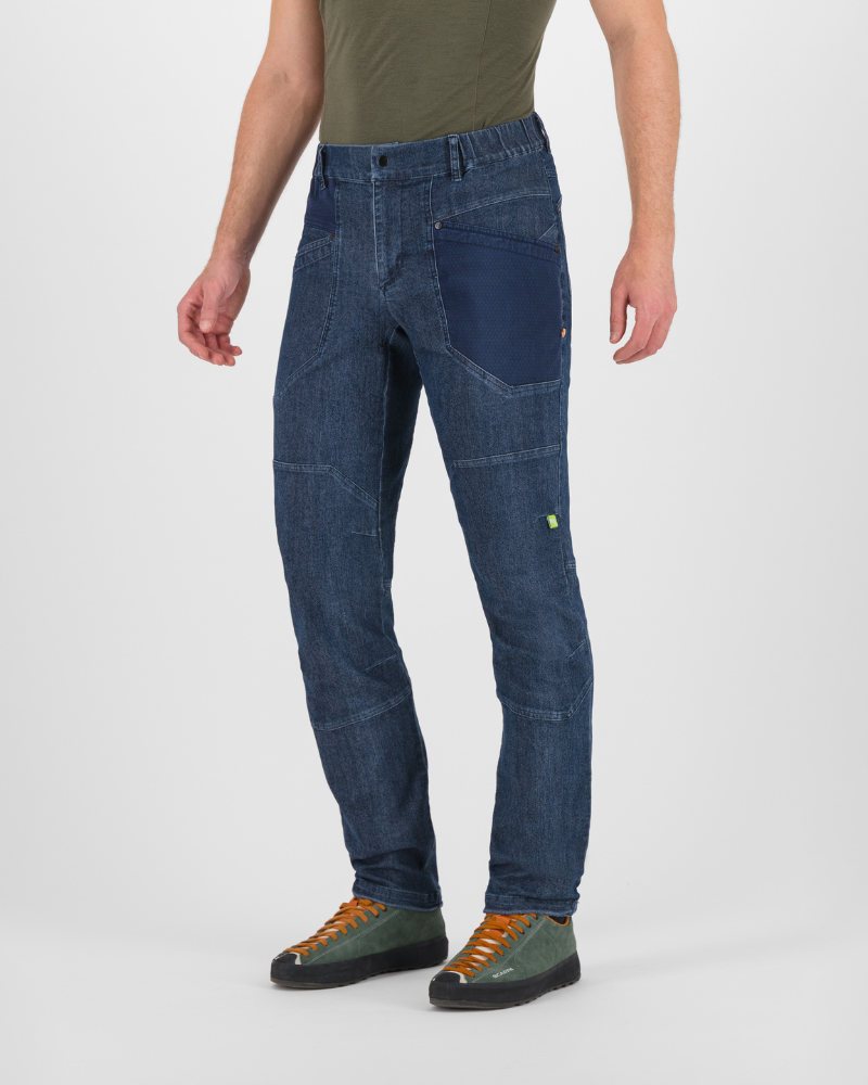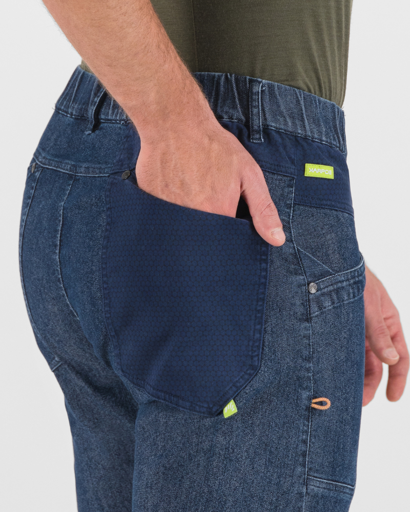Pánské kalhoty KARPOS LARICE JEANS s ústředně těžk é d ž ínsy pro celoro ční nošení . Na ša kolekce kalhot by nebyla kompletní bez měkkých, elastických d ž ínsů. Materiál je činí pohodlnými a použitelnými po celý rok. Pás má gumu a poutka na opasek. Stahovací šňůrky ve spodní části dělají tyto kalhoty ideálními na lezení v interiéru nebo na skalách.