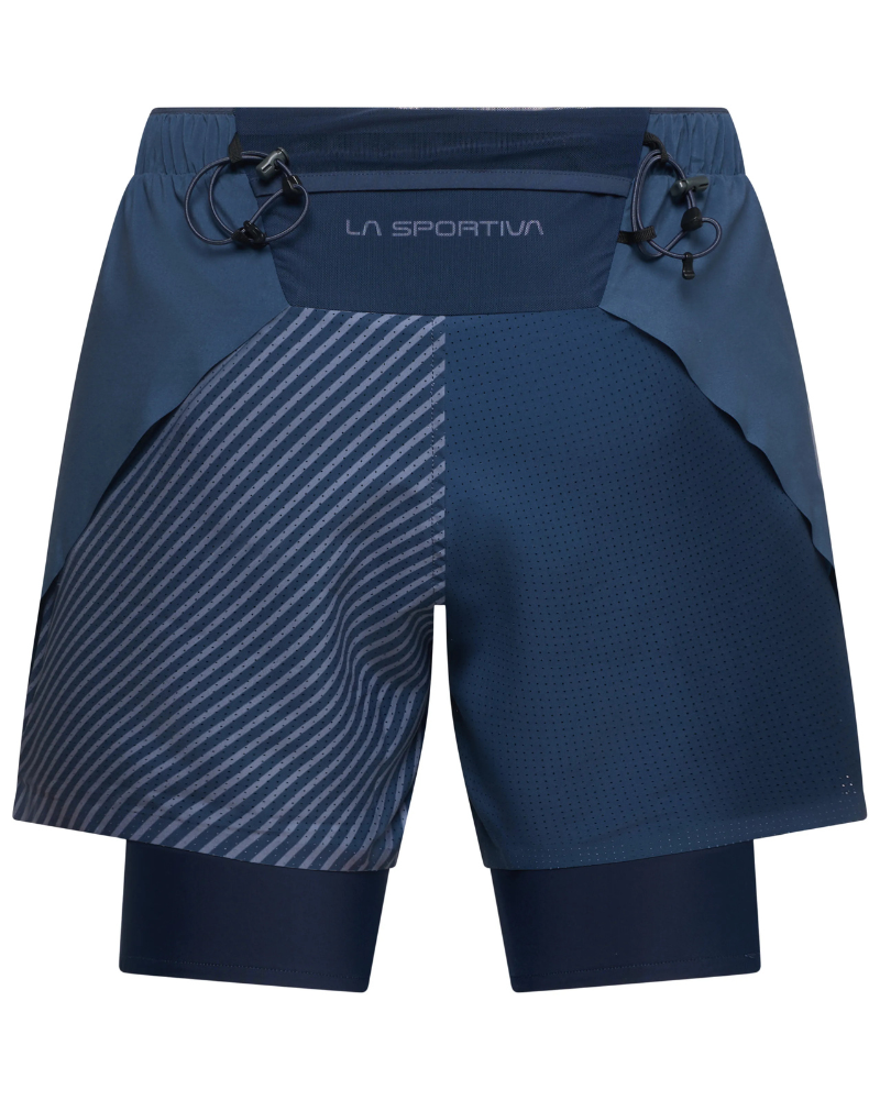 Šortky jsou vyrobeny z prodyšného materiálu doplněného laserem vyřezávanými perforacemi, které zlepšují větrání a pomáhají odvádět přebytečné teplo při vyšší zátěži. Integrovaná vnitřní podšívka s měkkým silikonovým úchytem poskytuje dodatečnou podporu a pohodlí a zároveň pomáhá udržet šortky a podšívku na místě. Konstrukce s překrývajícími se panely poskytuje velký rozsah pohybu při běhu do kopce az kopce. Šňůrka v pase umožňuje snadné utažení podle potřeby a podlepené lemy minimalizují tření a riziko odírání. Mezi praktické prvky patří kapsa na levém stehně a zadní síťovaná kapsa na zip. Součástí jsou i odnímatelná a nastavitelná reflexní poutka pro nošení holí nebo sbalené větrovky.