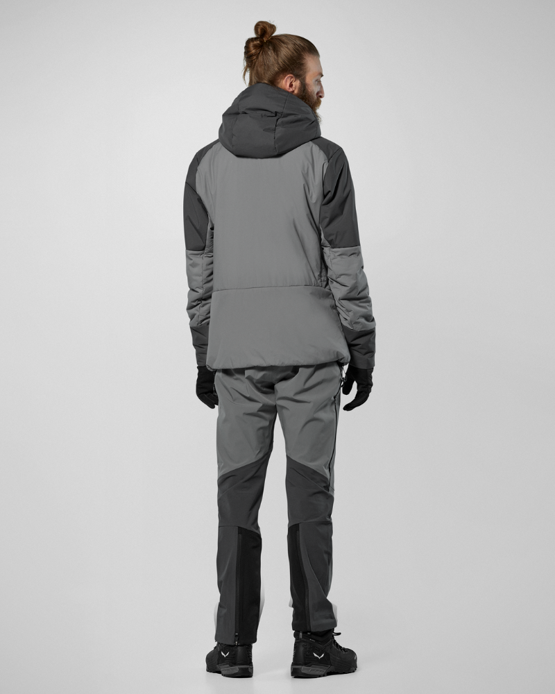 Táto izolačná bunda je kombináciou tirolskej vlny s čiastočne recyklovaným polyesterom. Jej duté vlákna zachytávajú a ukladajú vzduch blízko tela, vďaka čomu je ľahšia, má väčší loft a teplo aj za mokra. Pre zvýšenú priľnavosť na kapucni, ramenách, hornej časti rukávov a manžetách sme použili vrstvu našej vlastnej vodeodolnej tkaniny Powertex®. Má kapucňu kompatibilnú s prilbou, obojsmerný predný zips pre prístup k istiacemu zariadeniu, dve vnútorné sieťované vrecká a manžety s vnútorným pútkom na palec a reguláciou suchým zipsom na stiahnutie cez zimné rukavice.