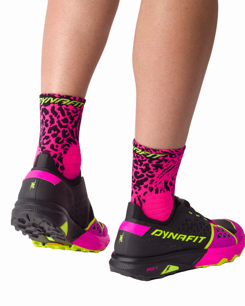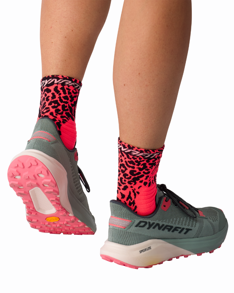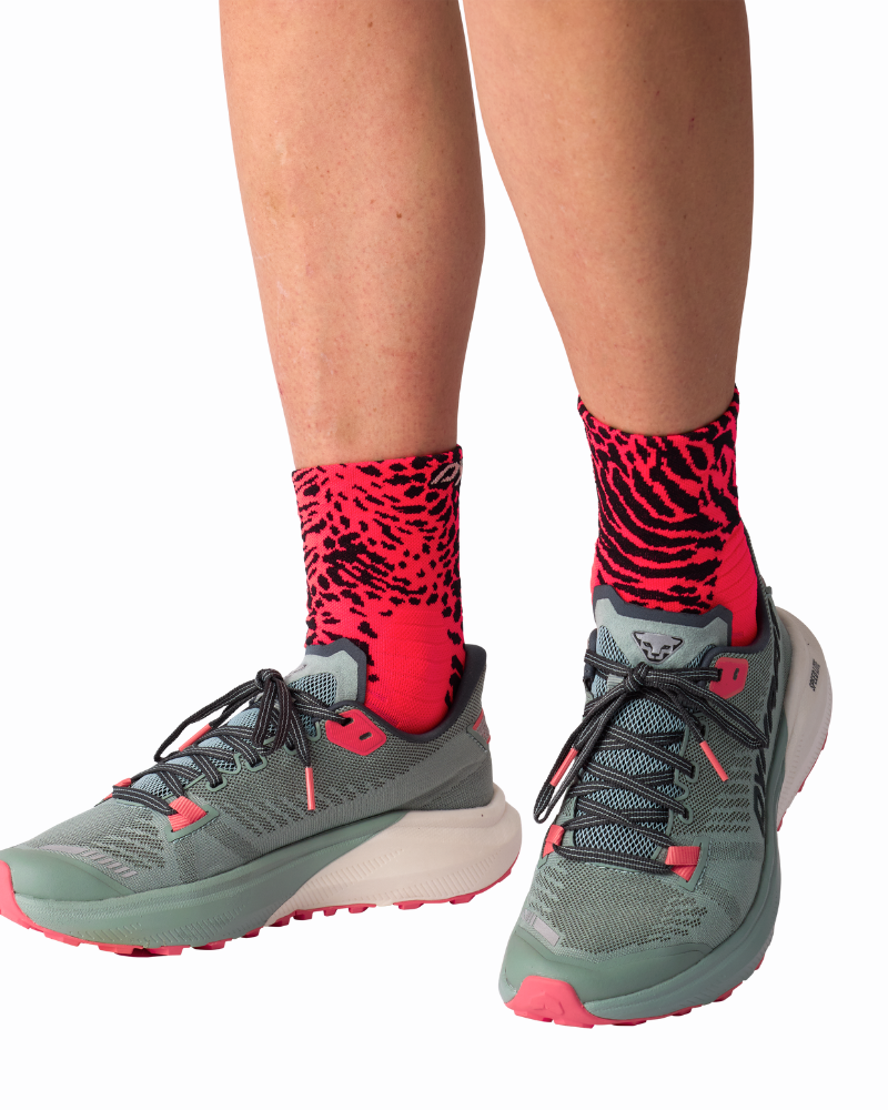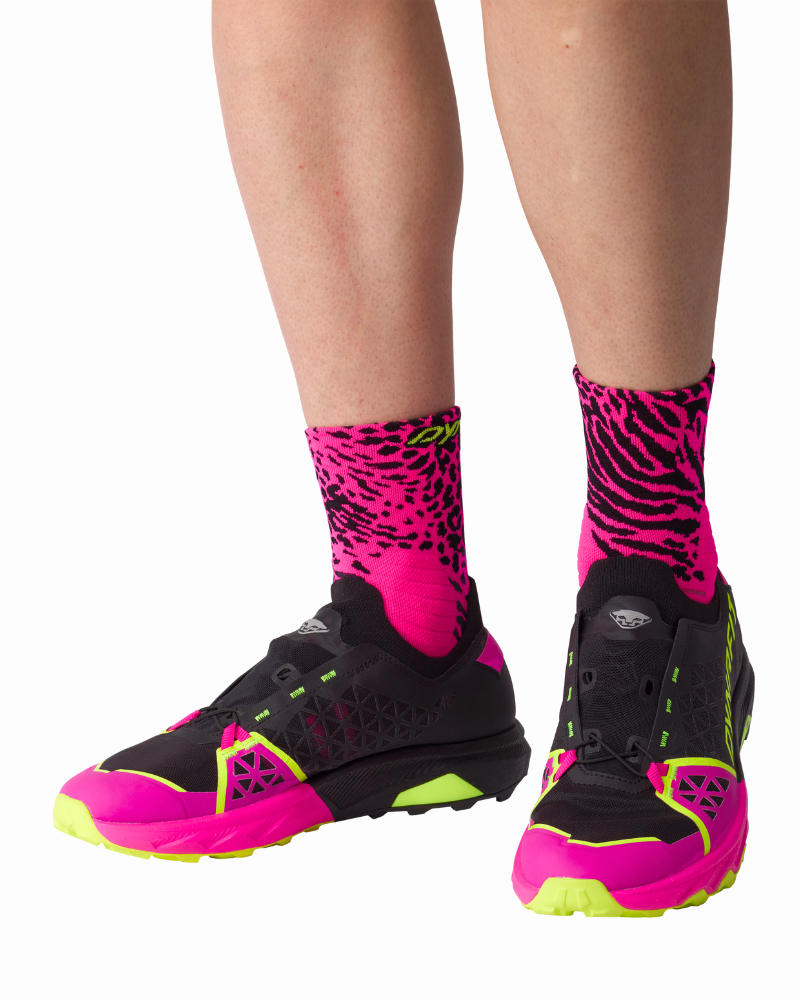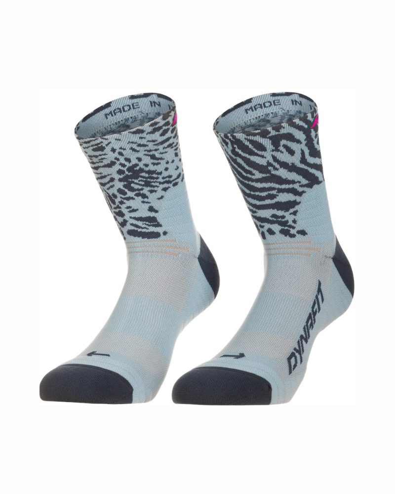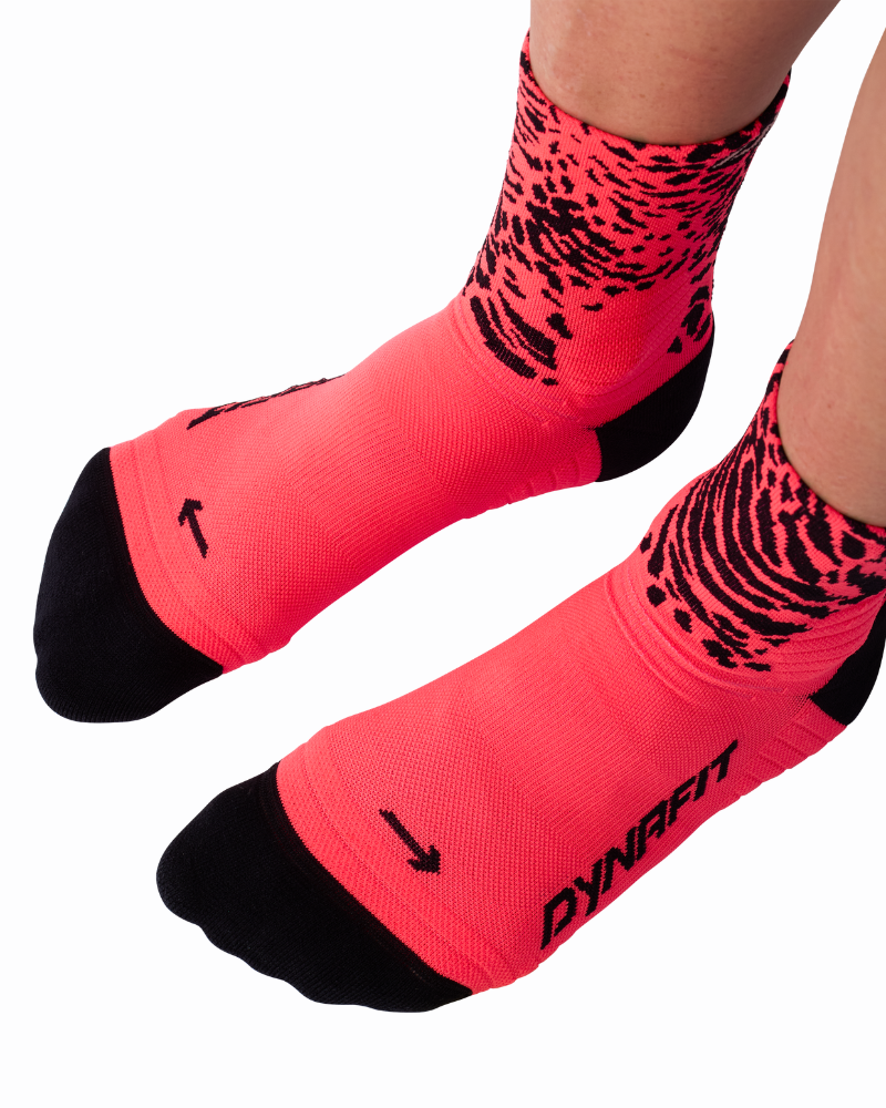 Ponožky DYNAFIT RUN WILD MID SK - ľahké bežecké ponožky sú stredne dlhé a majú vyvážené odpruženie pre ochranu a tlmenie nárazov bez toho, aby pridávali topánkam väčší objem. Strategicky umiestnené sieťované vložky zlepšujú priedušnosť. Anatomický dizajn vľavo a vpravo zaručuje perfektné prispôsobenie bez šmýkania, takže sa vám netvoria pľuzgiere. Vďaka pevnej nylonovej zmesi sú ponožky super odolné a ich pútavý dizajn bude pútať pozornosť.