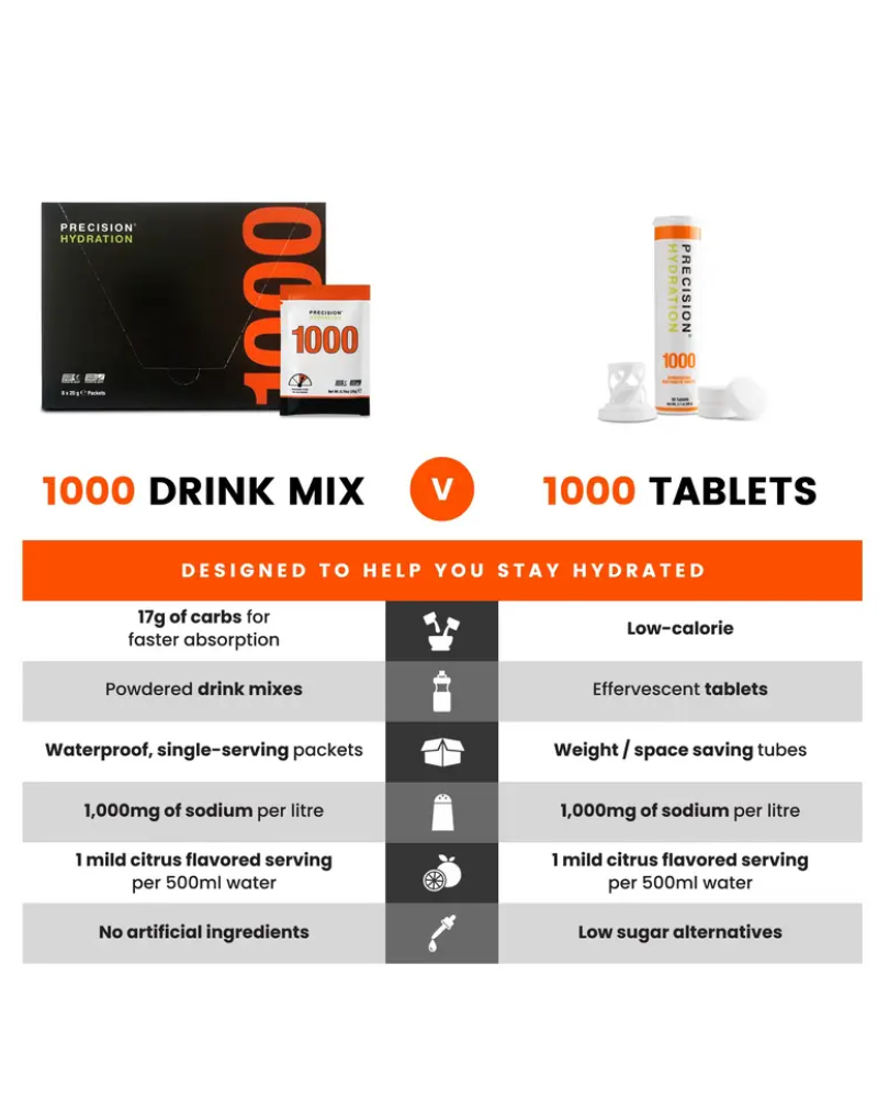 Precision PH 1000 Electrolytický drink - prášek je silný elektrolytický nápoj, který obvykle používají sportovci se střední až vysokou ztrátou potu/sodíku a ti, kteří cvičí v teplejších/vlhčích podmínkách.