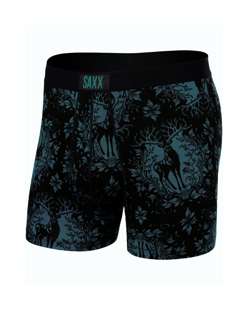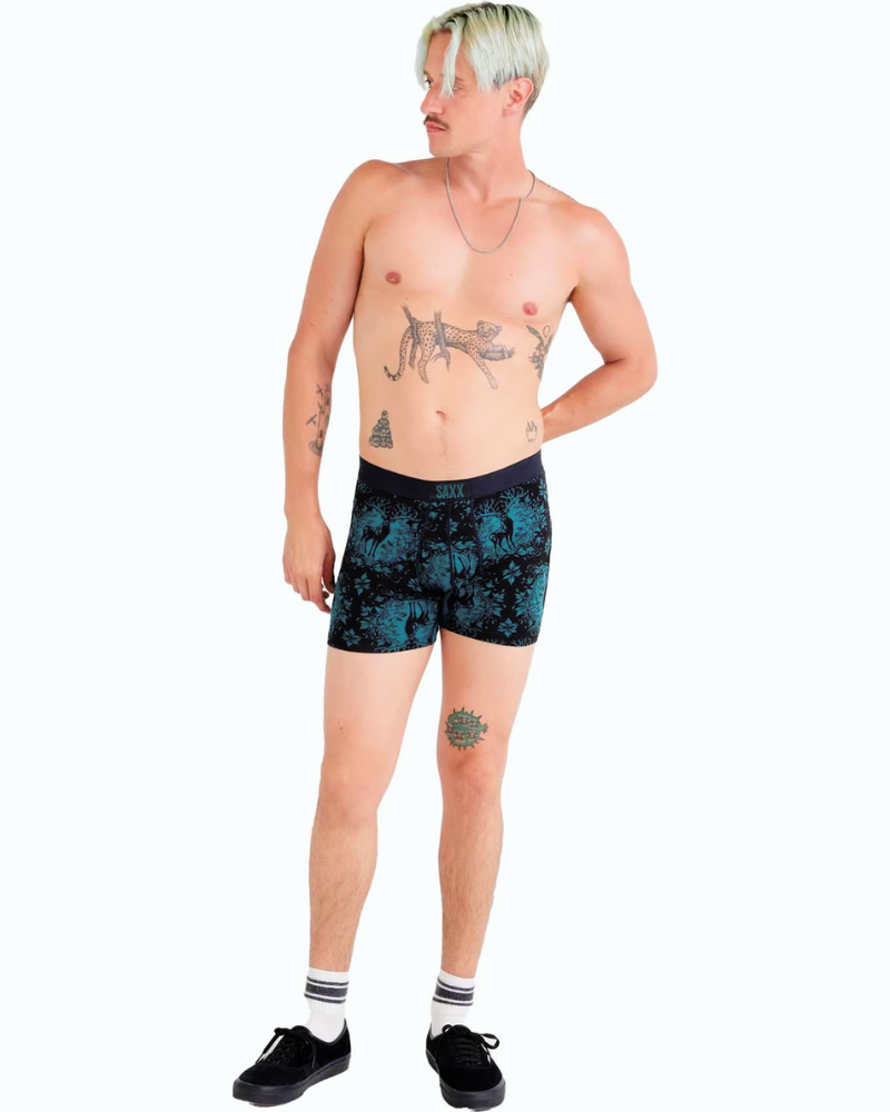 Boxerky SAXX ULTRA SOFT VIBE BB FLY mají uvolněný střih: přiléhavý kolem hýždí a stehen, mírně povoluje u nohy.