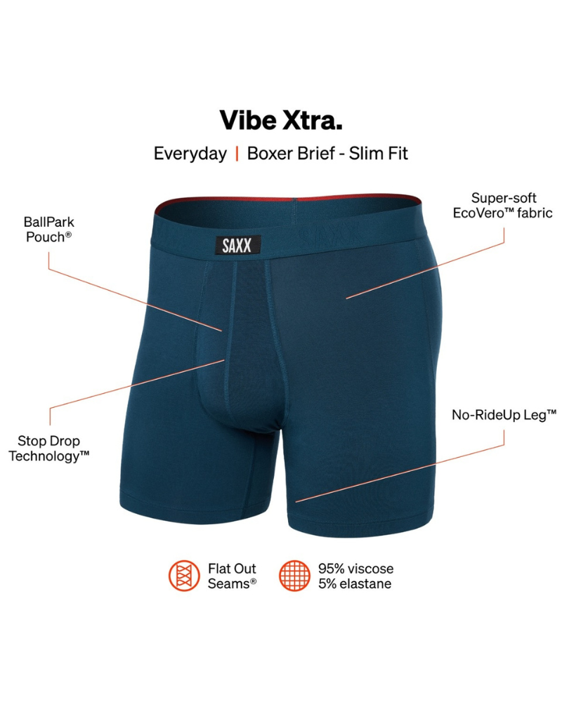 Boxerky SAXX VIBE XTRA SUPER SOFT BRIEF FLY – náš nejprodávanější model právě dostal zásadní upgrade. Vibe Xtra s technologií Stop Drop Technology™ obsahuje naši nejnovější technologickou inovaci pro odvod vlhkosti zabudovanou do sáčku BallPark®. Vibe Xtra je vyroben ze super měkké tkaniny a má lemování a NO-RIDEUP LEG™.