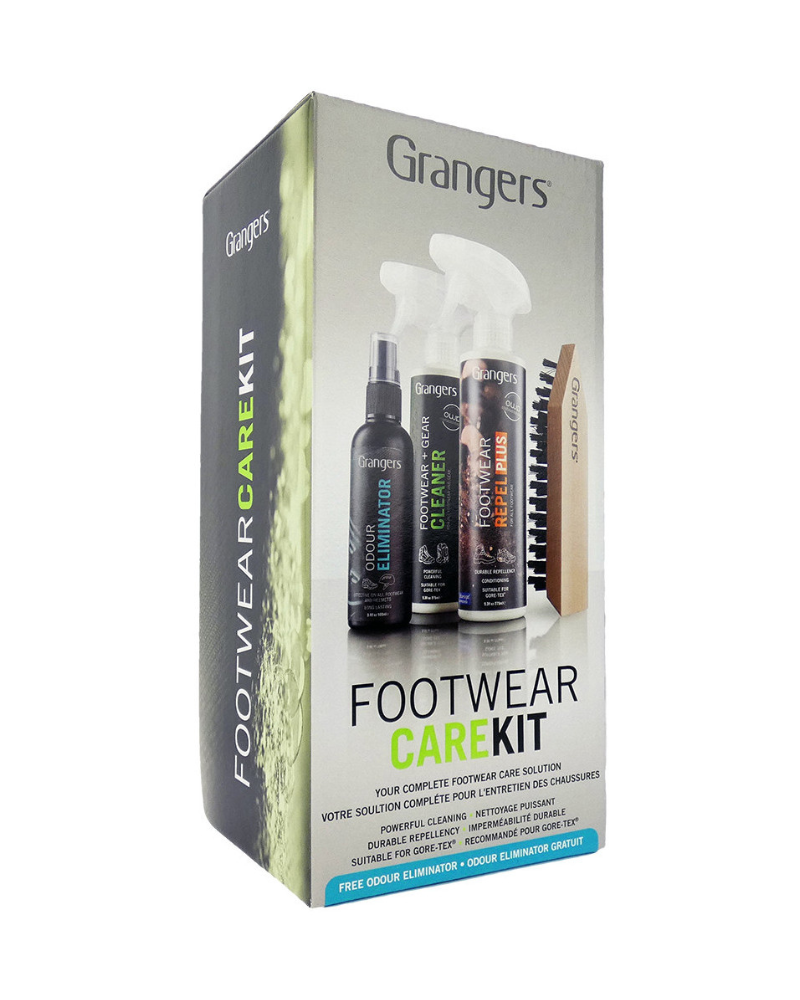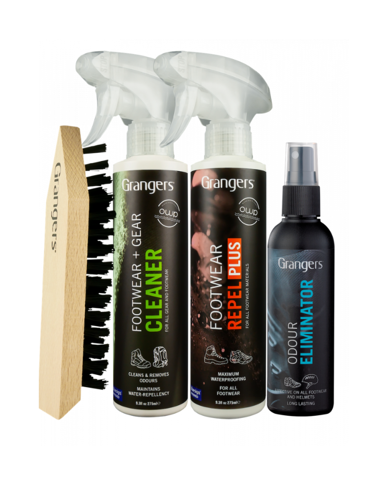 Set na ošetrovanie GRANGERS OWP FOOTWEAR CARE KIT je súprava na kompletnú starostlivosť o Vašu obuv obsahuje čistiaci prípravok v spreji Footwer + gear cleaner, impregnačný sprej Footwear repel plus, prípravok proti zápachu obuvi Odour eliminator a univerzálnu kefu.