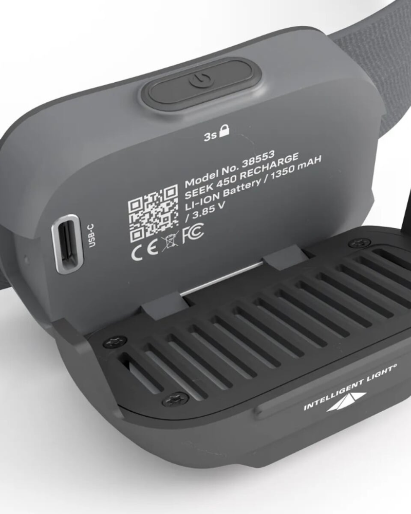 Čelovka SILVA Seek 450 s integrovanou dobíjecí Li-Ion baterií a 450 lumeny, je nejvýkonnějším modelem řady kompaktních čelovek Seek. Technologie Silva Intelligent Light – dvě bílé diody díky optice čoček rovnoměrně prosvítí prostor do dálky i stran, červená dioda pro tlumené, okolí nerušící svícení. Indikace stavu baterie formou zelené a červené diody, svítí-li po vypnutí čelovky zelená dioda, je stav baterie nad 50%, červená dioda indikuje kapacitu baterie pod 50%. Ve výklopné části svítidla je zabudován pasivní hliníkový chladič . Praktický zámek tlačítka proti nechtěnému zapnutí čelovky. Komfortní elastická čelenka je 25 mm široká az vnitřní strany má silikonový střed pro lepší stabilitu na hlavě, o nastavení obvodu se starají dvě rychlonastavitelné spony . Svítilna se nasazuje pomocí zadního klipu na elastickou čelenku a díky klipu lze snadno nasadit např. na hrudní popruh batohu… Seek 450 odolává tryskající vodě ze všech stran – IPX5. Jako hlavní materiál byly použity recyklované plasty. Celková hmotnost čelovky je 70g. Prodloužená záruka 5 let na čelovku a 2 roky na baterii.