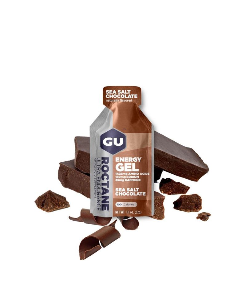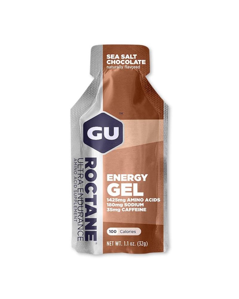 GU Roctane Energy gel - je jedinečný zdroj potřebných živin a energie pro dlouhé vzdálenosti a extrémní výkony, zejména při závodech. V pouhých 100 kaloriích je obsaženo 1425 mg větvených aminokyselin, leucin, valin a isoleucin. Ve srovnání s GU gelem obsahuje mnohem více esenciálních aminokyselin, které si tělo samo nedokáže syntetizovat, ale potřebuje je k ochraně svalových vláken při fyzickém výkonu. Ornithine alfa-ketaglutarát (OKG) blokuje nežádoucí ketabolické procesy (svalové křeče). Obsah 35 mg kofeinu stimuluje nervovou soustavu k lepší koncentraci. Stejné použití jako GU gel, ale s mnohem vyšším účinkem. Energetický gel ROCTANE obsahuje 3x více BCAA a 2x více elektrolytů v porovnání s našimi původními energetickými gely. Obsahují také aminokyseliny – taurin (pomáhají udržovat stažitelnost srdce a zlepšují srdeční výdej během dlouhých cvičení) a beta-alanin (pomáhá udržovat stabilní ph uvnitř buněk a tím zabránit jejich poškození). Energetické gely ROCTANE dodávají stejnou kombinaci sacharidů a stejný počet kalorií jako Enery Gely. Energetické gely ROCTANE jsou klíčovým nástrojem pro vysokou intenzitu nebo dlouhodobou aktivitu, kdy dochází k rychlému vyčerpání živin a poškození svalů.