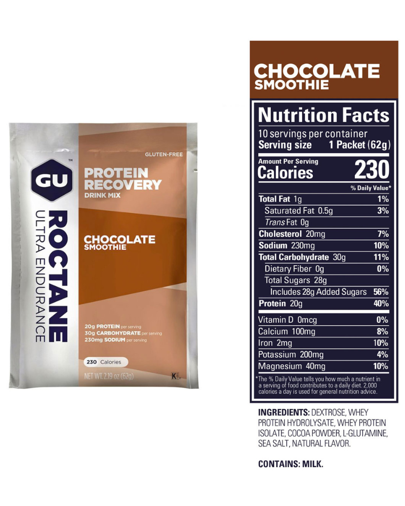 GU Roctane Recovery Drink Mix vyslechl požadavky sportovců na více bílkovin v nápoji a nyní přináší 2x více kvalitních bílkovin než původní Recovery Drink , čímž se rozšiřuje rodina Roctane. Recovery Drink obsahuje v jedné porci 20 g vysoce kvalitních syrovátkových bílkovin , které zabezpečují obnovu a rekonstrukci svalových vláken.